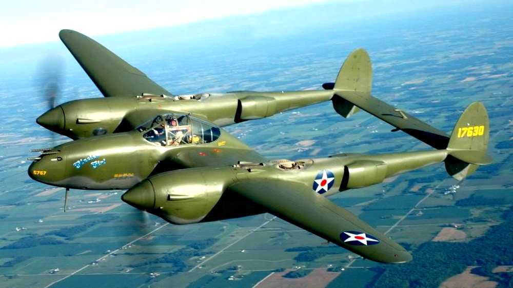 The Lockheed P-38 Lightning is a World War II-era American piston-engined fighter aircraft. Developed for the United States Army Air Corps, the P-38 had distinctive twin booms and a central nacelle containing the cockpit and armament. Allied propaganda claimed it had been nicknamed the fork-tailed devil (German: der Gabelschwanz-Teufel) by the Luftwaffe and "two planes, one pilot" (2????1?????, Ni hik?ki, ippairotto) by the Japanese. The P-38 was used for interception, dive bombing, level bombing, ground attack, night fighting, photo reconnaissance, radar and visual pathfinding for bombers and evacuation missions, and extensively as a long-range escort fighter when equipped with drop tanks under its wings.
